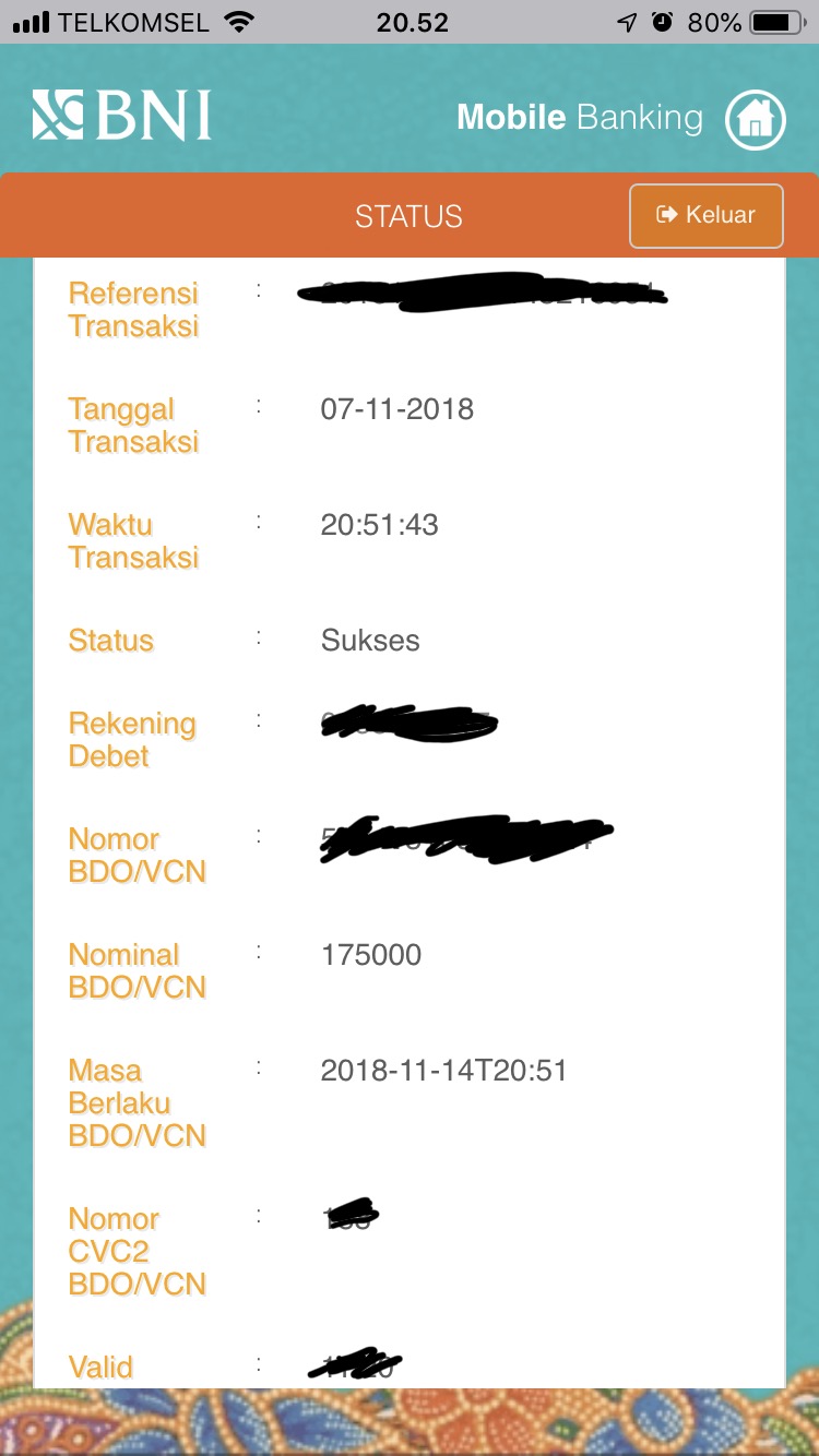 Berbekal informasi di internet, saya memutuskan untuk menggunakan VCN. VCN adalah, dalam bahasa saya, sebuah metode yang membuat kartu debit kita seolah-olah menjadi sebuah kartu kredit virtual dengan kuota tertentu. Ya, saat melakukan request VCN kita akan diminta memasukkan besaran angka “kuota” yang akan digunakan untuk pembayaran. Kebetulan saya punya rekening bank yang mendukung Debit Online VCN, yaitu BNI. Selain itu saya memang sering melakukan transaksi dengan menggunakan BNI Mobile di smartphone. Berikut adalah tautan mengenai Debit Online dari BNI http://www.bni.co.id/id-id/ebanking/bnidebitonline